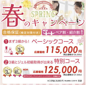 ジェルの基礎から学び、カリキュラム内で実技試験免除の特典を得られますので、校内での筆記試験でジェル初級の取得が可能です。